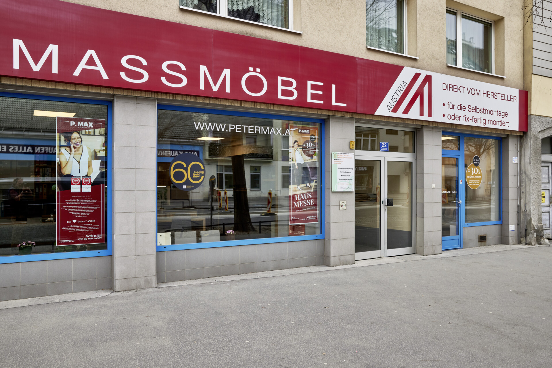 Den Eingang (Glastüre) finden Sie vis-a-vis der Firma Hofer, direkt in der Fassade des Geschäftes Peter Max.