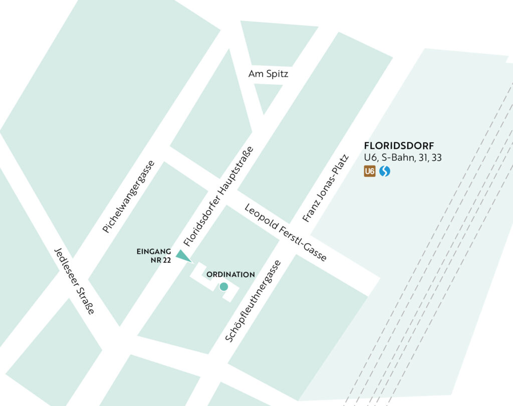 Die Ordination befindet sich im Haus 3 der Anlage Floridsdorfer Hauptstraße 22.